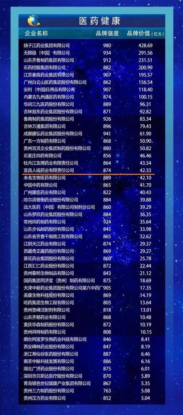 2019年5月9日,由新华社、经济日报社、中国国际贸易促进委员会、中国品牌建设促进会、中国资产评估协会等单位联合举办的“2019中国品牌价值评价信息发布”活动在上海举行。在此次发布会上,医药健康板块共49个品牌上榜,宜昌人福药业公司品牌价值位居第18位,品牌强度为874,品牌价值42.33亿元,较2018年的评估价值40.27亿元有了进一步提升。